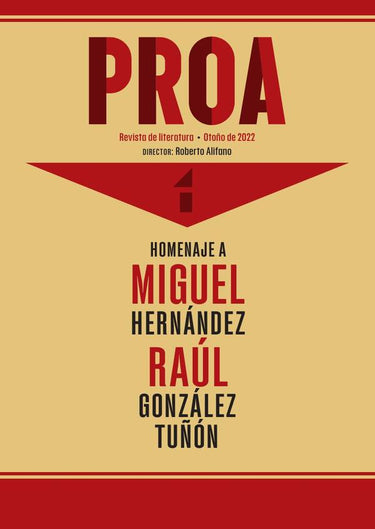 Nuestra Argentina resulta siempre el país del volver a empezar o, como hubiera preferido Nietzsche, del «eterno retorno», PROA no es ajena a esta regla. Solo que en este caso, volver los pasos hacia atrás significa renacer. En su tercera época nuestra revista llegó casi a los cien números publicados, superando a las dos etapas anteriores. Una hazaña, si tenemos en cuenta los avatares políticos y económicos que sufrió el país. Ahora, con menos inocencia que ilusión, iniciamos una cuarta época y aspiramos seguir adelante; eso sí, sin dejar de tener en cuenta la ardua época que nos toca vivir; pero teniendo en cuenta los modernos sistemas de difusión con los que contamos. PROA, sin dejar su formato gráfico, aparecerá también on-line. La generosidad de una empresa farmacéutica nos brinda el correspondiente apoyo logístico y el arte de la palabra, junto a las demás artes nos hará decir presentes otra vez en estos difíciles aunque esperanzadores tiempos. Empezamos con una serie de números especiales dedicados a la amistad y coincidencia entre poetas. En este primer caso estará referido a dos grandes de nuestro idioma: el español Miguel Hernández y el argentino Raúl González Tuñón, que se conocieron en los dramáticos días de una Guerra Civil que se cobró miles de víctimas. Miguel y Raúl fueron entrañables poetas y nos dejaron un imborrable testimonio de esa relación que pretende cobrar vida en las páginas que les hemos dedicado con el aporte de reconocidos estudiosos. Tenemos también en cuenta y va como homenaje, los ochenta años que se conmemoran de la trágica muerte del aedo de Orihuela. Nuestra gratitud al director de la Fundación Cultural Miguel Hernández, Aitor Larrabide, por su labor de coordinación, y a todos los que con sus colaboraciones hicieron posible este número sin duda perdurable. Damos comienzo a una cuarta etapa. Nos arriesgamos y el tiempo juzgará. Creemos, también, que la cultura (o la crisis cultural que atravesamos) se merece esta renovada singladura que nos esperanza una vez más. Roberto Alifano