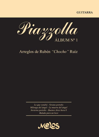 Primer álbum de la colección de este legendario guitarrista argentino. Dirigido al guitarrista especializado, quien encontrará todos los recursos del género, un perfecto glosario del estilo, en las experimentadas vivencias de Ruiz.Hoy el tango es música universal. Interpretarlo requiere, claro está, de conocer sus giros, sus acentos, sus aspectos típicos. Algunos de estos aspectos pasan por la instrumentación y la historia del tango se nutre así de páginas imborrables que surgieron de pianos, bandoneones y violines. No obstante, la guitarra es, quizás, el instrumento más noble al tango ya que su sonido está presente desde los inicios de la guardia vieja hasta nuestros días. La música de Astor Piazzolla no desconoció esto último. La guitarra fue un pilar ineludible de su formación más trascendente, esto es, su quinteto. Interpretar entonces tangos antológicos de Piazzolla en guitarra, con los gestos propios del género, es, al menos, un desafío. Las versiones de Chocho Ruíz que integran este libro alcanzan un nivel superlativo y respetan holgadamente el pensamiento de Piazzolla, así como también los giro s propios del tango y la literatura guitarrística. Dueño de una extensa y experimentada carrera, Chocho Ruíz invita al lector a recorrer desde la guitarra dichas obras, aportando así una compilación cuidada y necesaria.